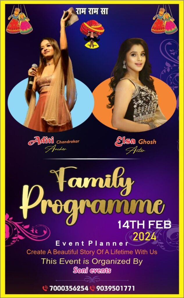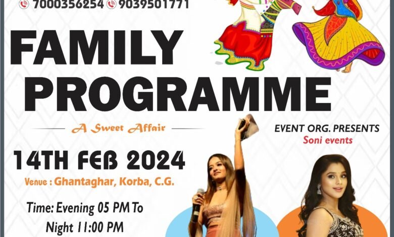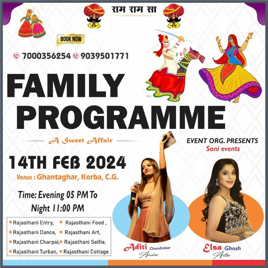 कोरबा ,औद्योगिक नगरी कोरबा में 14 फरवरी को घंटाघर ओपन आडोटोरियम में संध्या 5 बजे से मातृ पितृ दिवस के अवसर पर पूर्ण तह पारिवारिक कार्यक्रम कोरबा में एक शाम राजस्थानी संस्कृति के संग का आयोजन किया गया है जिसमे राजस्थान की संस्कृति को उकेरा जाएगा जिसमे मिलेंगे राजस्थानी नृत्य, पारंपरिक ब्यनज,कला व संस्कृति के साथ साथ मशहूर बॉलीवुड कलाकार एकता घोष व उनकी टीम की सांस्कृतिक संध्या का आयोजन किया गया है सोनी इवेंट के डायरेक्टर सोनी अग्रवाल ने बताया कि कोरबा में पहली बार हो रहे इस तरह के आयोजन की सभी तैयारी कर ली गई है जिसमे राजस्थान के 50 से अधिक लोगो की उपस्थिति के साथ इस अनूठे आयोजन में लाइव कार्यक्रम का लुत्फ कोरबा सहित आस पास के लोग उठा सकेंगे इस आयोजन के लिए प्रवेश पत्र की अनिवार्यता सुनिश्चित की गई है