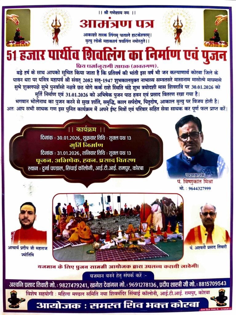 कोरबा ,कोरबा की पावन धरा पर एक बार फिर भक्ति, श्रद्धा और जनकल्याण का भव्य संगम देखने को मिलेगा, जनकल्याण और आध्यात्मिक उन्नयन के उद्देश्य से प्रतिवर्ष की भांति इस वर्ष भी 51 हजार पार्थिव शिवलिंग निर्माण एवं पूजन-अभिषेक का विराट आयोजन किया जा रहा है।