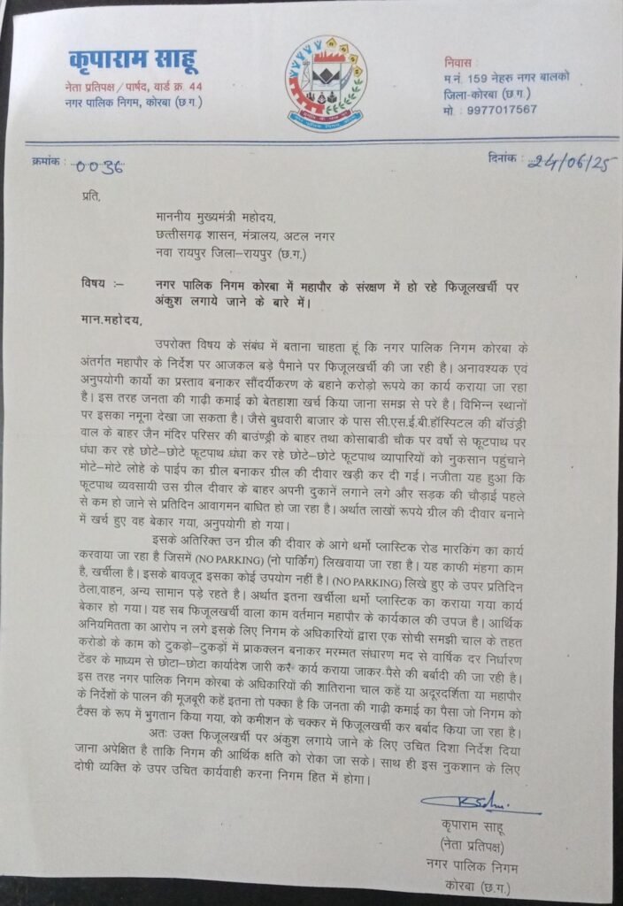 कोरबा, नेता प्रतिपक्ष कृपाराम साहू ने कहा कि नगर पालिक निगम कोरबा के अंतर्गत महापौर के निर्देश पर बड़े पैमाने पर फिजूलखर्ची की जा रही है। अनावश्यक एवं अनुपयोगी कार्यों का प्रस्ताव बनाकर सौंदर्याकरण के बहाने करोड़ो रूपये का कार्य कराया जा रहा है। इस तरह जनता की गाढ़ी कमाई को बेतहाशा खर्च किया जाना समझ से परे है। विभिन्न स्थानों पर इसका नमूना देखा जा सकता है। जैसे बुधवारी बाजार के पास सी.एस.ई.बी. हॉस्पिटल की बॉउंड्री वाल के बाहर जैन मंदिर परिसर की बाउण्ड्री के बाहर तथा कोसाबाडी चौक पर वर्षों से फूटपाथ पर धंधा कर रहे छोटे-छोटे फूटपाथ धंधा कर रहे छोटे-छोटे फूटपाथ व्यापारियों को नुकसान पहुंचाने मोटे-मोटे लोहे के पाईप का ग्रील बनाकर ग्रील की दीवार खड़ी कर दी गई। फूटपाथ व्यवसायी उस ग्रील दीवार के बाहर अपनी दुकानें लगाने लगे और सड़क की चौड़ाई पहले से कम हो जाने से प्रतिदिन आवागमन बाधित हो जा रहा है। अर्थात लाखों रूपये ग्रील की दीवार बनाने में खर्च हुए वह बेकार गया, अनुपयोगी हो गया।