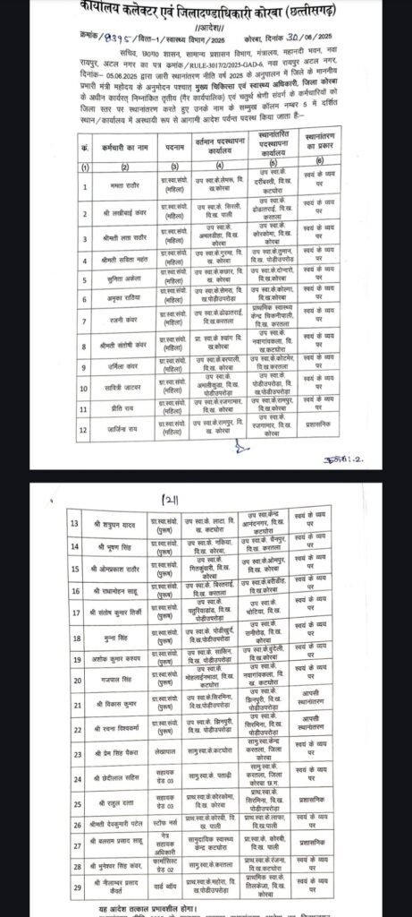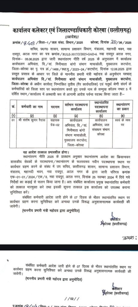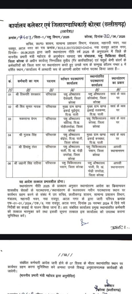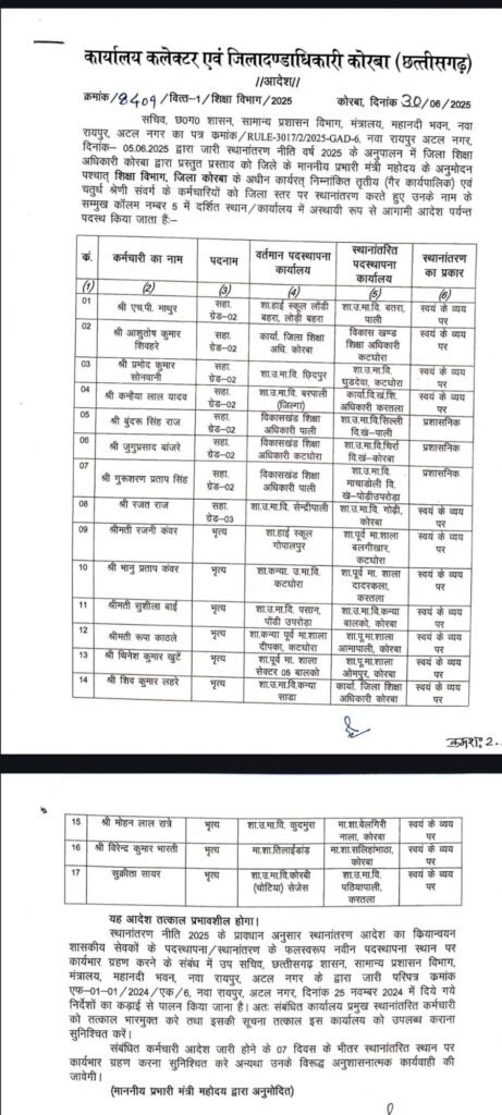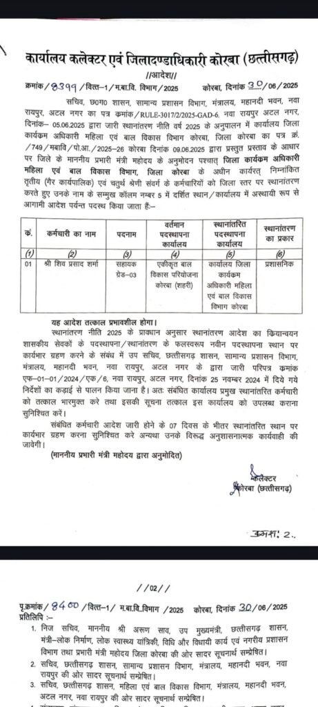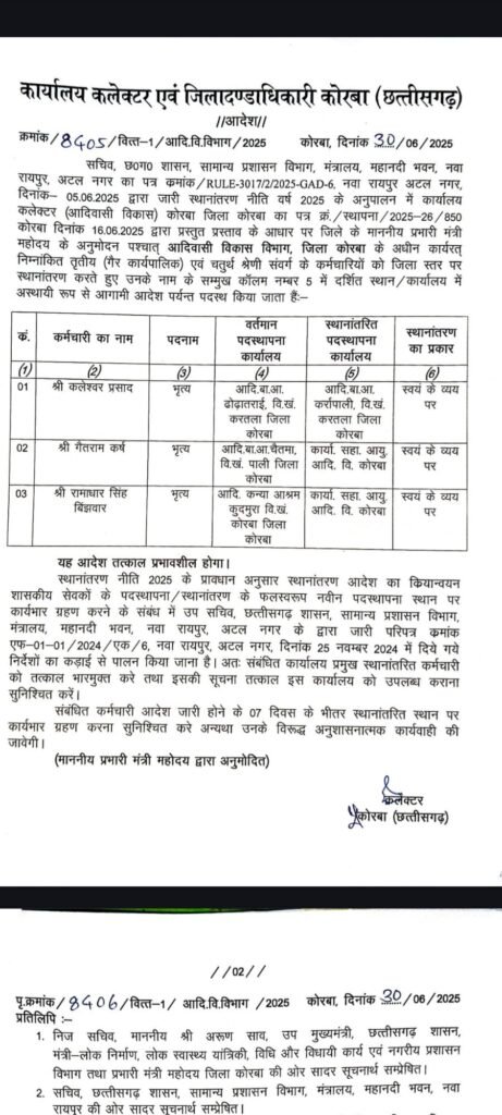 कोरबा, छत्तीसगढ़ शासन के सामान्य प्रशासन विभाग की स्थानांतरण नीति 2025 के परिपालन में जिले के प्रभारी मंत्री के अनुमोदन पश्चात कोरबा कलेक्टर अजीत वसंत ने विभिन्न विभागों में कर्मचारियों के तबादले किए हैं। तबादला संबंधी आदेश जारी कर दिया गया है। यह तबादले संबंधित कर्मियों द्वारा आपसी सहमति, स्वयं के व्यय पर तथा कुछ मामलों में प्रशासनिक स्तर पर किए गए हैं। उपरोक्त सभी कर्मचारियों को नई पदस्थापना स्थल पर सात दिवस के भीतर कार्यभार ग्रहण करने निर्देशित किया गया है।