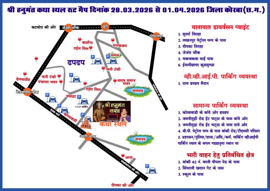 कोरबा ,कोरबा-पश्चिम में बांकीमोंगरा क्षेत्र अंतर्गत ग्राम ढपढप के विशाल मैदान में बाबा बागेश्वर धाम सरकार पंडित धीरेंद्र शास्त्री की हनुमंत कथा के लिए जिला व पुलिस प्रशासन के द्वारा सुरक्षा और आवागमन की व्यवस्था के मद्देनजर पूरी तैयारी कर ली गई है। जिला पुलिस ने कथा स्थल तक आने-जाने का मार्ग से लेकर पार्किंग और प्रतिबंधित मार्ग के संबंध में रोडमैप (रूट चार्ट) जारी कर दिया है।