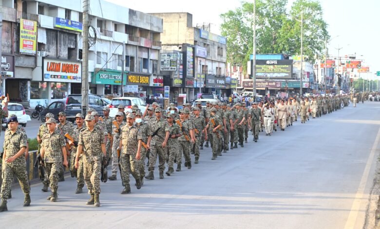 0 शहर के सभी प्रमुख चौक चौराहे और मोहल्ला में पहुँची पुलिस की फ्लैग मार्च