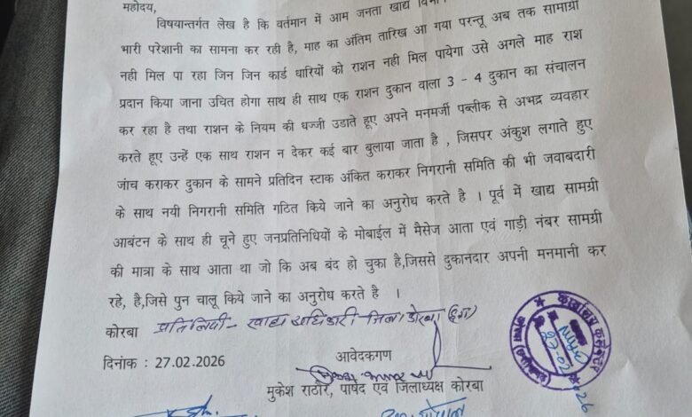 कोरबा ,जिला कांग्रेस अध्यक्ष एवं पार्षद मुकेश राठौर, नेता प्रतिपक्ष कृपाराम साहु, उपनेता प्रतिपक्ष गोपाल कुर्रे, पार्षद रवि सिंह चंदेल, कोरबा ब्लॉक अध्यक्ष पालुराम साहु, पार्षद टामेश अग्रवाल सहित कांग्रेस पदाधिकारियों ने कलेक्टर कार्यालय में शिकायत दर्जकर उचित मूल्य की दुकानों में राशन वितरण को लेकर गंभीर अनियमितता का आरोप लगाया है साथ ही खाद्य अधिकारी घनश्याम कंवर से भेंटकर ज्ञापन सौंपा गया है । जिसमें आरोप लगाया गया है कि खाद्य विभाग के लापरवाही के कारण आम जनता को भारी परेशानियों का सामना करना पड़ रहा है । फरवरी माह पार हो गया लेकिन फरवरी माह का राशन सामग्री हितग्राहियों को अब तक नहीं मिला है । ज्ञापन के माध्यम से बताया गया कि ऐसे कई संचालक हैं जो एक से अधिक सरकारी राशन दुकानों का संचालन कर रहे हैं जिस कारण भी हितग्राहियों को परेशान होना पड़ रहा है । कई संचालक एक बार में पूरा राशन नहीं देते और बार – बार बुलाकर हितग्राहियों को परेशान करते हैं । पहले खाद्य सामग्री आबंटन की जानकारी प्रत्येक वार्डवासियों को मिल जाया करता था जिसे वर्तमान में बंद कर दिया गया है ।