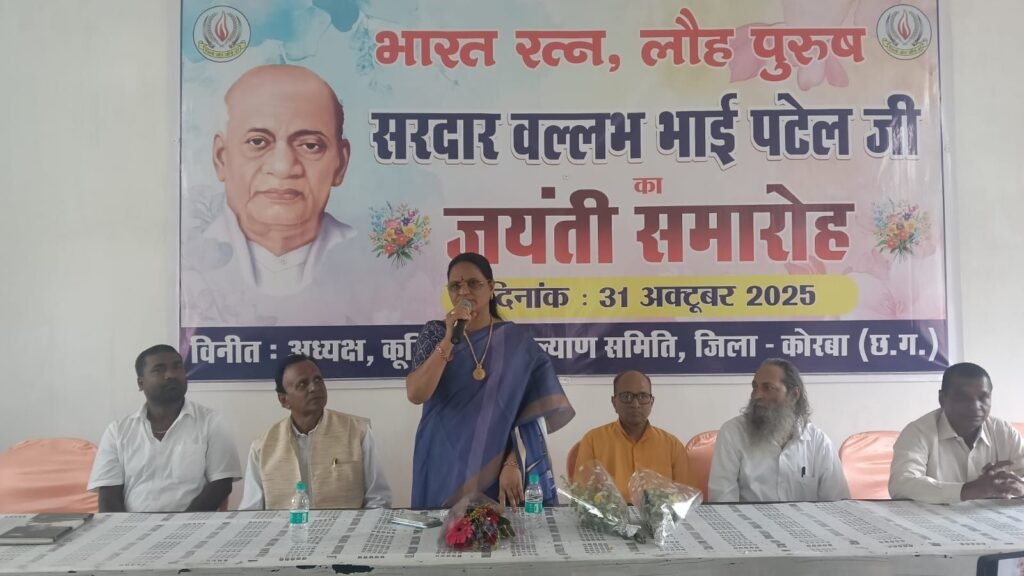 कोरबा ,भारत रत्न और लौह पुरुष सरदार वल्लभभाई पटेल की जयंती के अवसर पर कुर्मी क्षत्रिय कल्याण समिति, जिला कोरबा की ओर से कुर्मी समाज भवन में भव्य समारोह का आयोजन किया गया। समारोह में समाज के सैकड़ों सदस्य, नगर के गणमान्य नागरिक और विभिन्न सामाजिक संगठनों के प्रतिनिधि बड़ी संख्या में उपस्थित रहे।