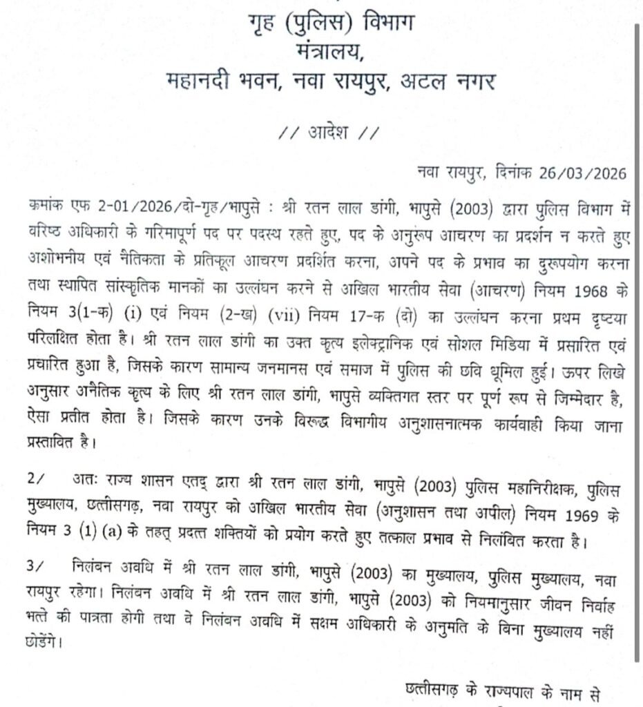रायपुर, भारतीय पुलिस सेवा के अधिकारी आईजी रतन लाल डांगी को अंतत छत्तीसगढ़ शासन के गृह (पुलिस) विभाग ने निलंबित कर दिया है। विगत महीनों में उनके ऊपर लगे महिला सम्बन्धी गंभीर आरोपों और आपत्तिजनक तस्वीरें वायरल होने के बाद शासन द्वारा कराई गई जांच उपरांत उनके आचरण को अनुचित मानते हुए निलंबन की यह कार्रवाई की गई है।
