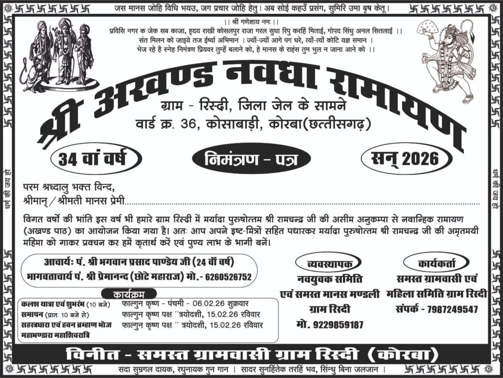 कोरबा, वार्ड क्रमांक 36 स्थित ग्राम रिसदी में कल से अखंड नवधा रामायण का विधिवत शुभारंभ हो गया है। यह धार्मिक आयोजन निरंतर 34वें वर्ष में प्रवेश कर चुका है। अखंड नवधा रामायण 6 फ़रवरी 2026 से 15 फ़रवरी 2026 तक चलेगी, जिसमें प्रतिदिन प्रभु श्रीरामचंद्र जी की अमृतमयी कथा का पाठ एवं श्रवण किया जा रहा है।