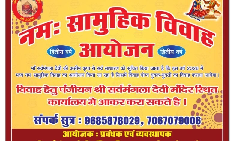 नम: सामूहिक विवाह की फिर तैयारी:माँ सर्वमंगला देवी मंदिर के पुण्य परिसर में 31 गरीब कन्याएं फिर परिणय सूत्र में बंधेंगेमाँ सर्वमंगला देवी मंदिर प्रबंधन द्वारा तैयारी तेज