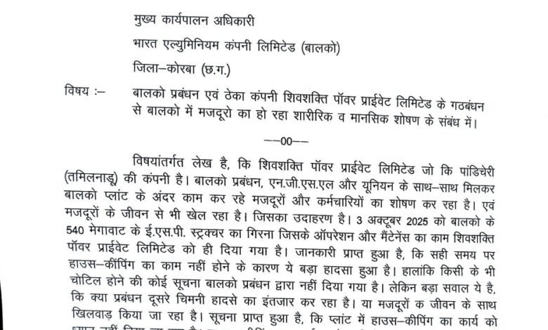 पत्र में उल्लेख किया गया है कि दिनांक 3 अक्टूबर 2025 को बालको के 540 मेगावाट यूनिट के ईएसपी स्ट्रक्चर गिरने की घटना ठेका कंपनी और प्रबंधन की गंभीर लापरवाही का परिणाम है। ईएसपी के ऑपरेशन और मेंटेनेंस की जिम्मेदारी शिवशक्ति पावर प्रा. लि. को दी गई थी।