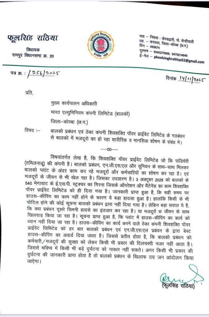 कोरबा, रामपुर विधानसभा क्षेत्र के विधायक फूलसिंह राठिया ने बालको प्रबंधन और ठेका कंपनी शिवशक्ति पावर प्राइवेट लिमिटेड पर गंभीर आरोप लगाते हुए मजदूरों की सुरक्षा व अधिकारों की अनदेखी का मुद्दा जोरदार तरीके से उठाया है। इस संबंध में उन्होंने बालको के मुख्य कार्यपालन अधिकारी को पत्र लिखकर उच्चस्तरीय जांच की मांग की है।