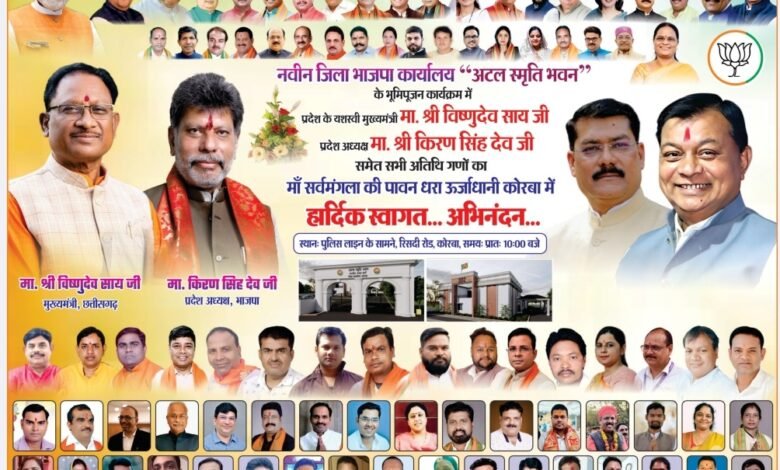 कोरबा , भारतीय जनता पार्टी कोरबा के द्वारा 02 फरवरी 2026 सोमवार को भाजपा के नवीन जिला कार्यालय ‘अटल स्मृति भवन’ का भव्य भूमि पूजन कार्यक्रम सुबह 10 बजे से आयोजित किया गया है। इस कार्यक्रम में छत्तीसगढ़ के मुख्यमंत्री विष्णुदेव साय मुख्य अतिथि के रूप में शामिल होकर इसकी आधारशिला रखेंगे।