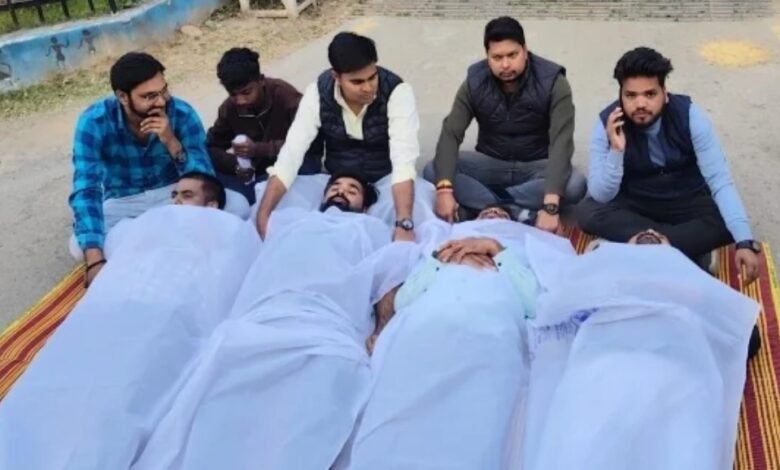युवा कांग्रेस ने कलेक्ट्रेट के सामने कफ़न ओढ़कर किया प्रदर्शन