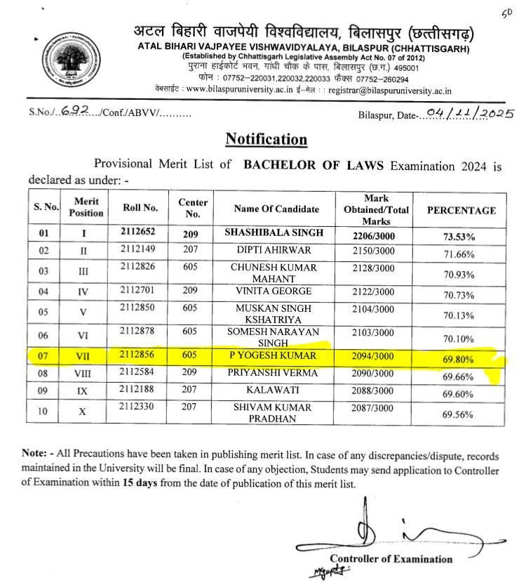 कोरबा,अटल बिहारी वाजपेयी विश्वविद्यालय, बिलासपुर (छ.ग.) द्वारा घोषित एल.एल.बी. (Bachelor of Laws) परीक्षा 2024 की प्रोविजनल मेरिट लिस्ट में एडवोकेट पी. योगेश कुमार ने 07वाँ स्थान प्राप्त किया है, जिन्होंने 2094/3000 अंक (69.80%) हासिल किए हैं। यह सफलता मेहनत, अनुशासन और सतत अध्ययन का परिणाम है। एडवोकेट पी. योगेश कुमार ने सफलता का श्रेय शिक्षकों, परिवार और सहयोगियों के मार्गदर्शन एवं समर्थन से ही संभव बताया है। योगेश ने बताया कि लक्ष्य न्याय और समाज सेवा के क्षेत्र में निरंतर योगदान देना है।”