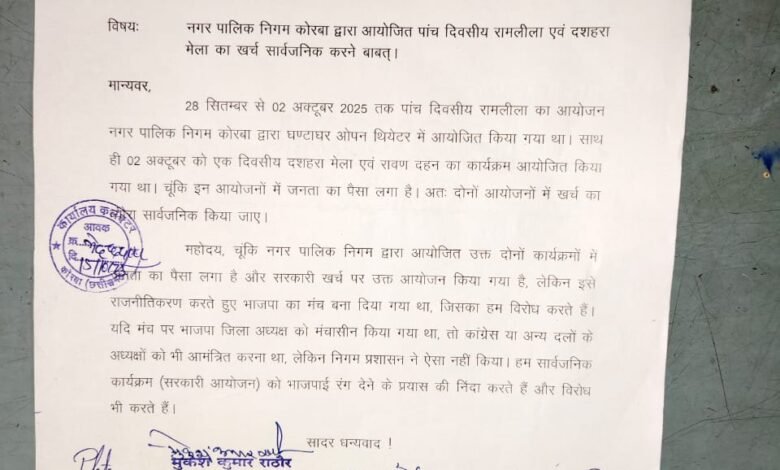 कांग्रेस ने निगम से दोनों आयोजनों—रामलीला और दशहरा मेला—का पूरा खर्च सार्वजनिक करने की मांग की है। उनका कहना है कि पारदर्शिता जरूरी है ताकि जनता को पता चल सके कि सरकारी खजाने से कितना पैसा कहां खर्च हुआ।