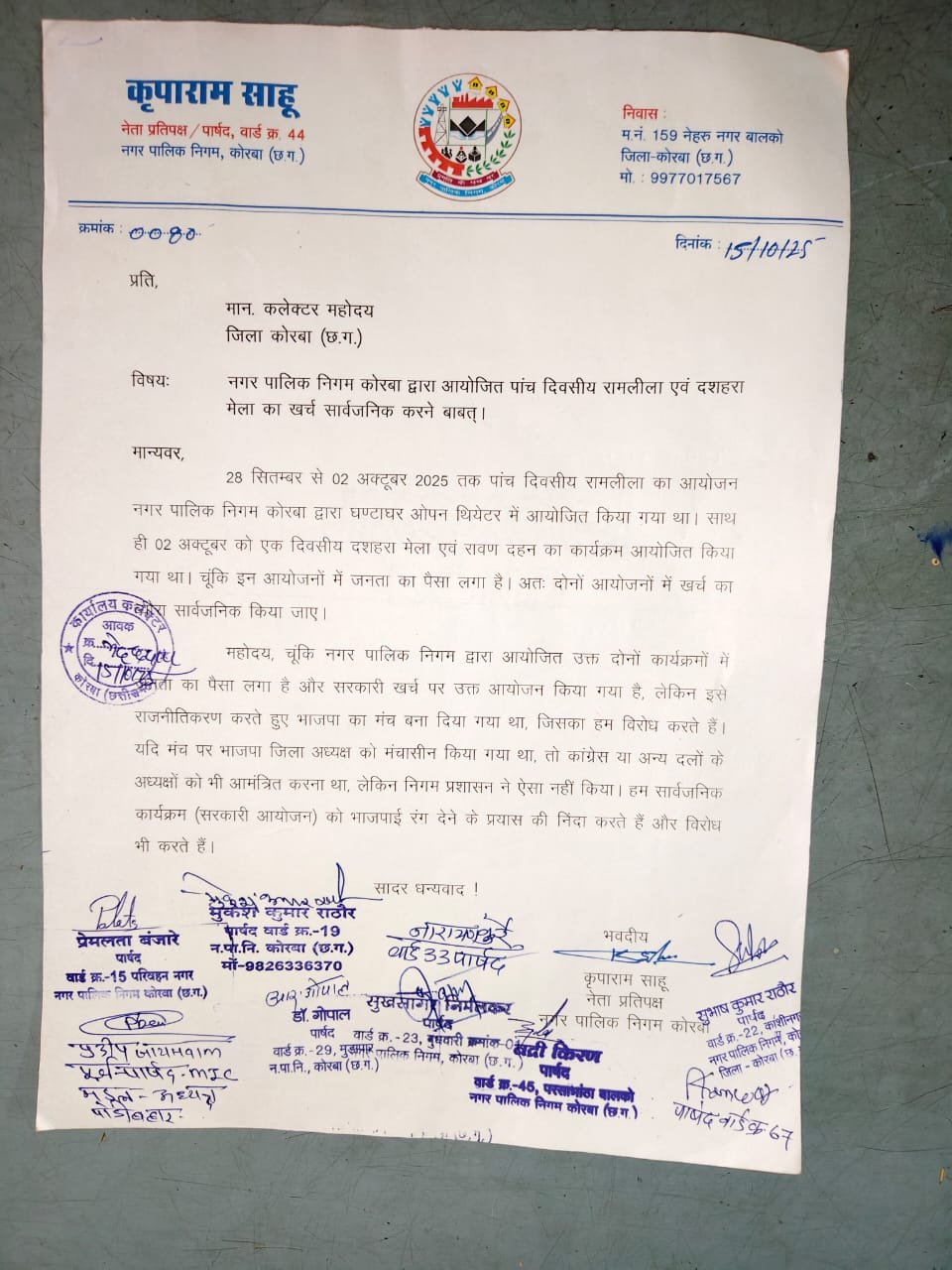 कांग्रेस ने निगम से दोनों आयोजनों—रामलीला और दशहरा मेला—का पूरा खर्च सार्वजनिक करने की मांग की है। उनका कहना है कि पारदर्शिता जरूरी है ताकि जनता को पता चल सके कि सरकारी खजाने से कितना पैसा कहां खर्च हुआ।