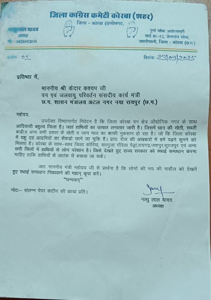 पत्र में साफ लिखा गया है कि कटघोरा वन मंडल के गांव—तनेरा, सरगुजा गोरैया, पेंड्रापारा, सतरेंगा, जरगढ़ूगुड़ा समेत कई इलाकों में हाथियों का आतंक लगातार बढ़ रहा है। धान और सब्जियों की फसलें चौपट हो रही हैं, मकान ढह रहे हैं और कई परिवार जानमाल के खतरे में जी रहे हैं।
