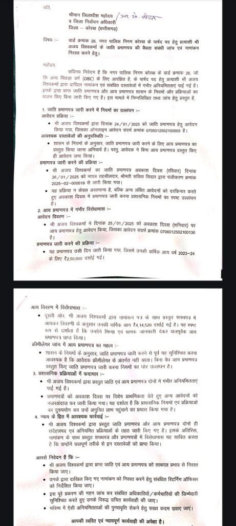 कोरबा,कोरबा नगर पालिक निगम के वार्ड 26 (पं. रविशंकर नगर) के पार्षद पद के भाजपा प्रत्याशी अजय विश्वकर्मा के जाति और आय प्रमाण पत्र में गंभीर अनियमितताएं सामने आने के बाद से ही चुनावी माहौल में उथल-पुथल मच गई है। यह वार्ड अन्य पिछड़ा वर्ग (OBC) के लिए आरक्षित है और अजय के प्रत्याशी बनने के बाद से स्थानीय निवासियों में असंतोष का माहौल बना हुआ था। विशेष रूप से, अजय वार्ड 32 के निवासी हैं, जो वार्ड 26 से लगभग 5 किलोमीटर दूर स्थित है, और लोग यह सवाल उठा रहे थे कि छोटे-छोटे कामों के लिए उन्हें अजय के घर जाना पड़ेगा।
