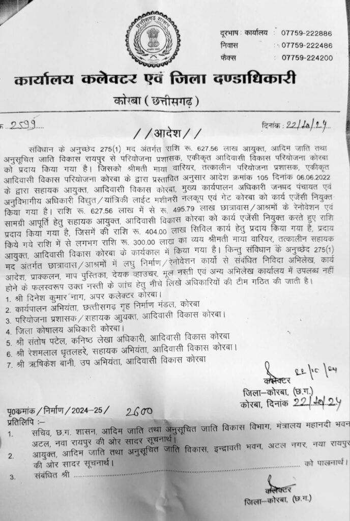 जारी जांच आदेश में कहा गया है कि- संविधान के अनुच्छेद 275 (1) मद अंतर्गत राशि रु. 627.56 लाख आयुक्त, आदिम जाति तथा अनुसूचित जाति विकास रायपुर से परियोजना प्रशासक, एकीकृत आदिवासी विकास परियोजना कोरबा को प्रदाय किया गया है। जिसको श्रीमती माया वारियर, तत्कालीन परियोजना प्रशासक, एकीकृत आदिवासी विकास परियोजना कोरबा के द्वारा प्रस्तावित अनुसार आदेश क्रमांक 105 दिनांक 06.06.2022 के द्वारा सहायक आयुक्त, आदिवासी विकास कोरबा, मुख्य कार्यपालन अधिकारी जनपद पंचायत एवं अनुविभागीय अधिकारी विद्युत/यांत्रिकी लाईट मशीनरी नलकूप एवं गेट कोरबा को कार्य एजेंसी नियुक्त किया गया है। राशि रू. 627.56 लाख में से रू. 495.79 लाख छात्रावास / आश्रमों के रेनोवेशन एवं सामग्री आपूर्ति हेतु सहायक आयुक्त, आदिवासी विकास कोरबा को कार्य एजेंसी नियुक्त करते हुए राशि प्रदाय किया है, जिसमें की राशि गया रु. 404.00 लाख किया सिविल कार्य हेतु प्रदाय गया है, प्रदाय किये गये राशि में से लगभग राशि रू. 300.00 लाख का व्यय श्रीमती माया वारियर, तत्कालीन सहायक आयुक्त, आदिवासी विकास कोरबा के कार्यकाल में किया गया है। किन्तु संविधान के अनुच्छेद 275 (1) मद अंतर्गत छात्रावास/आश्रमों में लघु निर्माण / रेनोवेशन कार्यों से संबंधित निविदा अभिलेख, कार्य आदेश, प्राक्कलन, माप पुस्तिका, देयक व्हाउचर, मूल नस्ती एवं अन्य अभिलेख कार्यालय में उपलब्ध नहीं होने के फलस्वरूप उक्त नस्ती के जांच हेतु नीचे लिखे अधिकारियों की टीम गठित की जाती है।