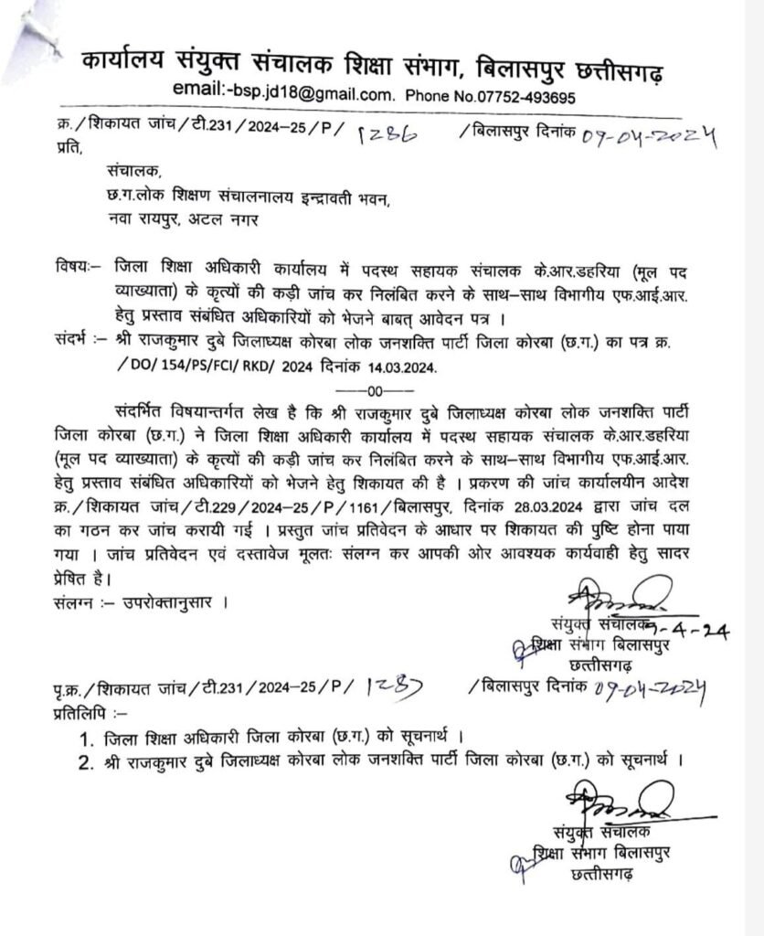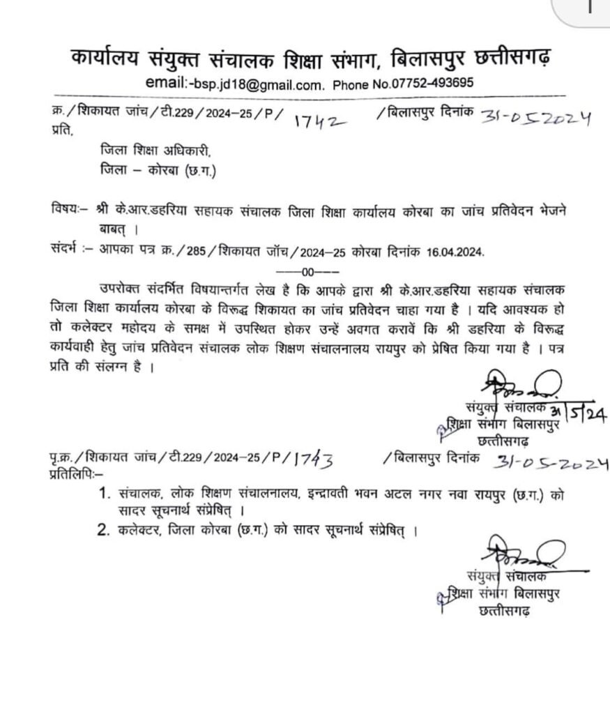 कोरबा जिला शिक्षा विभाग में पदस्थ सहायक संचालक केआर डहरिया पर कई तरह के आरोप लगे हैं। आरोपों पर संयुक्त संचालक की तरफ से जांच के लिए कमेटी का गठन किया गया। स्वयंभू डीईओ (सहायक संचालक) केआर डहरिया के खिलाफ भ्रष्टाचार, दुर्व्यवहार और नाफरमानी के मामले की जांच अप्रैल महीने में शुरू हुई थी, जिसमें कई स्तर पर डहरिया के खिलाफ आरोपों की पुष्टि हुई है। तीन सदस्यीय कमेटी ने इस मामले में अपनी रिपोर्ट संयुक्त संचालक को सौंपी जिसके आधार पर डहरिया के खिलाफ कार्रवाई का प्रस्ताव शासन स्तर पर भेजा गया है।
