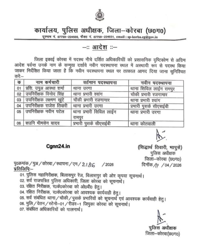 कोरबा,पुलिस अधीक्षक सिद्धार्थ द्वारा प्रशासनिक दृष्टिकोण से जिले में पदस्थ पुलिस अधिकारियों के तबादले का आदेश जारी किया गया है। जारी आदेश के अनुसार 6 अधिकारियों को तत्काल प्रभाव से नवीन पदस्थापना स्थल पर भेजा गया है तथा उन्हें शीघ्र कार्यभार ग्रहण करने के निर्देश दिए गए हैं।